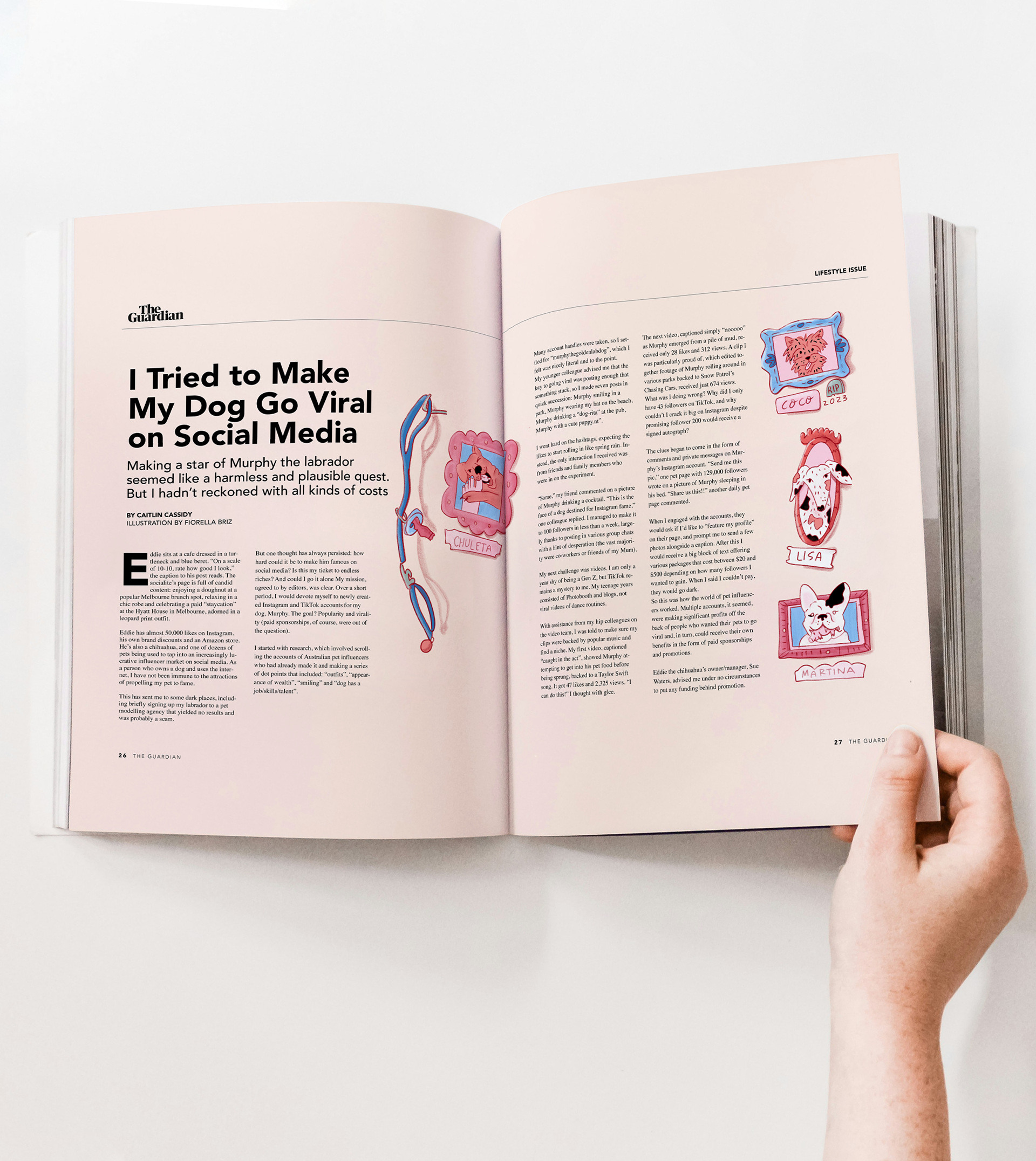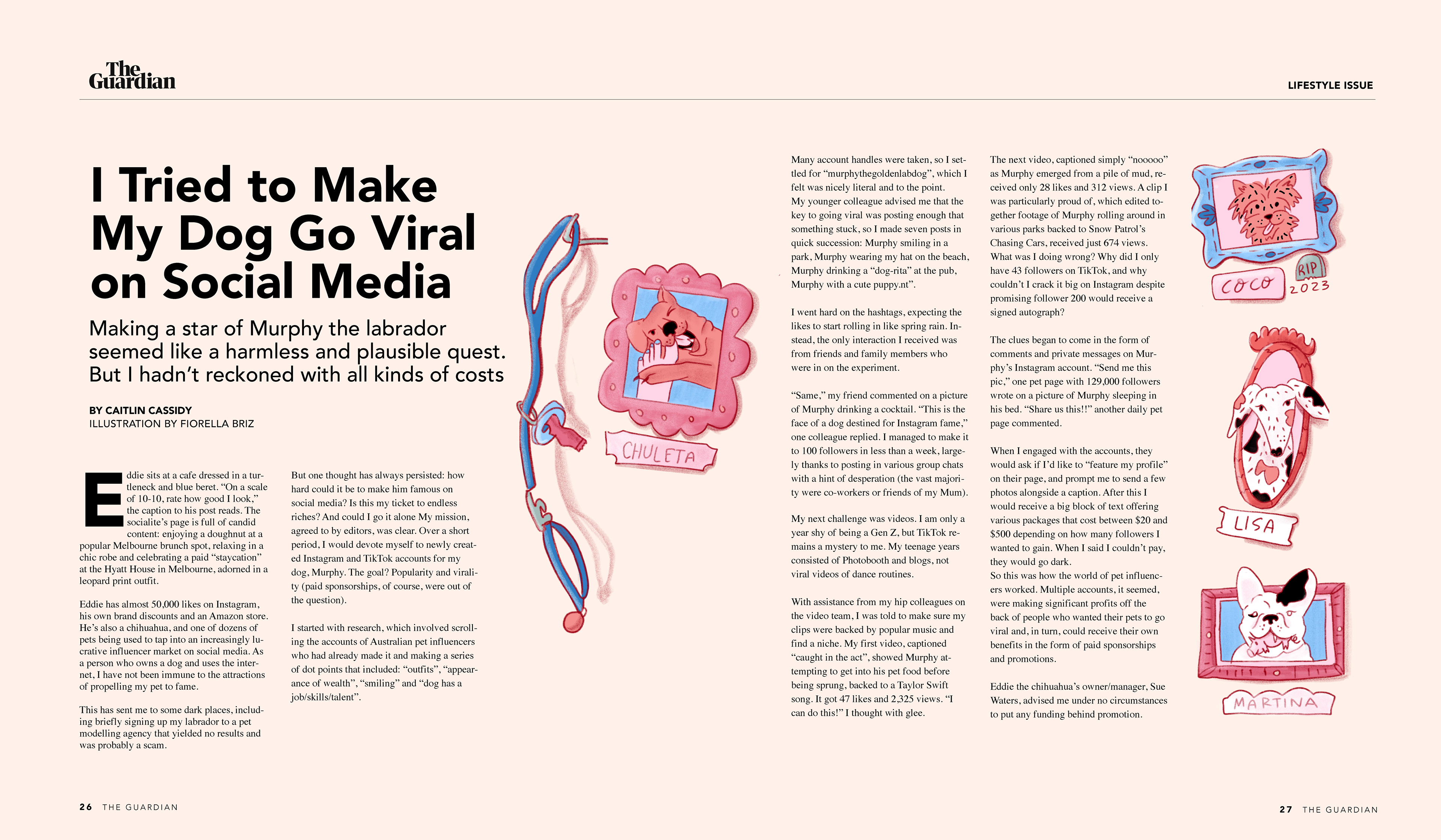 Illustration for the article "I Tried to Make My Dog Go Viral on Social Media" Written by Caitlin Cassidy for The Guardian. The story focuses on the harmless and plausible power that is being a pet content creator.